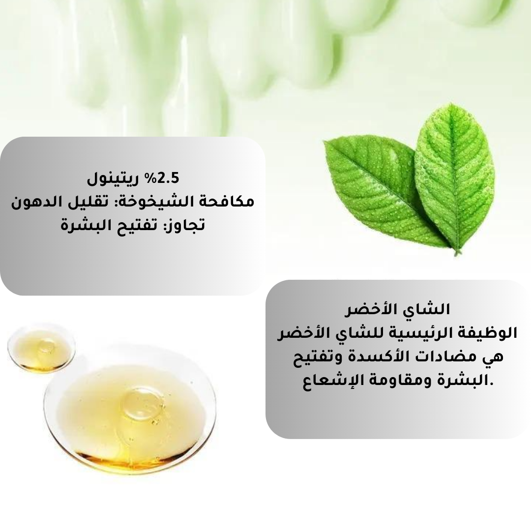 يتميز كريم Retinol بمكونات فعّالة مثل فيتامين C المضاد للأكسدة، الذي يحمي البشرة من الأضرار ويقلل التصبغات، والأربوتين الذي ينظم إنتاج الميلانين لتوحيد لون البشرة بشكل طبيعي